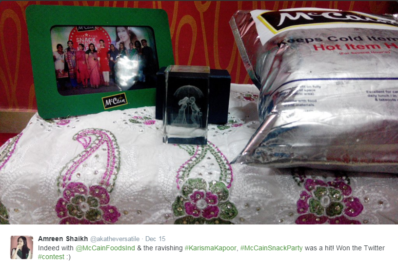 Later, we were entertained with hilarious acts, dance and quiz which kept us glued throughout the event and in the end, the twitter and facebook results were announced. I was shocked to hear my name as the Twitter Winner and I was gifted with a cute Paper Weight cum Showpiece. We also got a printed and framed photo of the picture we clicked with Karisma Ma’am. The session ended with the Snack Party and the McCain Hamper!
