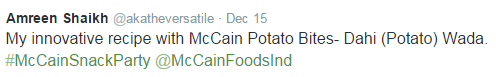 We had Twitter & Facebook Contest where we needed to share our innovative recipes with McCain Snacks and the best Tweet & Post would win a gift. Since I already was overwhelmed with ideas due to the #DessertChallenge session, I promptly shared a tweet of how I would use McCain Chilli Potato Bites to prepare McCain Potato Dahi Wada.