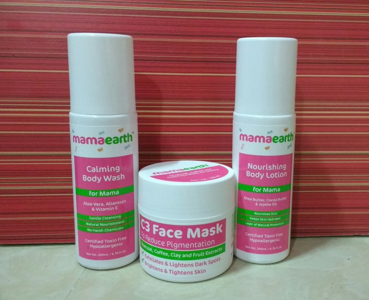 This month, The Expert Aunt, as the team calls me, sent 3 products from Mamaearth range for the moms. The products came in a travel friendly pouch in shades of pink and blue. I’m always in love with their packaging. The products that I received this month are Mamaearth C3 Face Pack, Mamaearth Calming Body Wash & Nourishing Lotion.