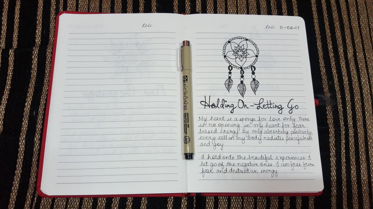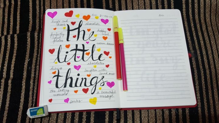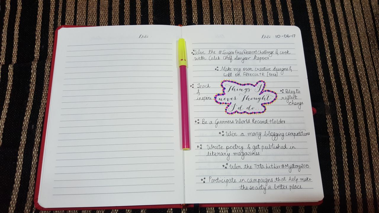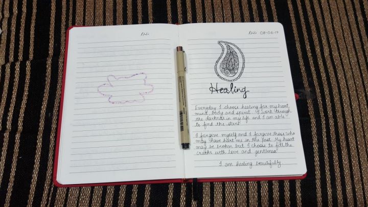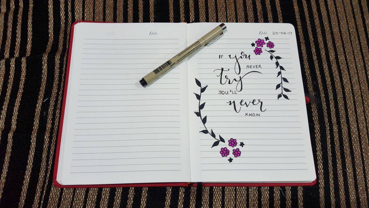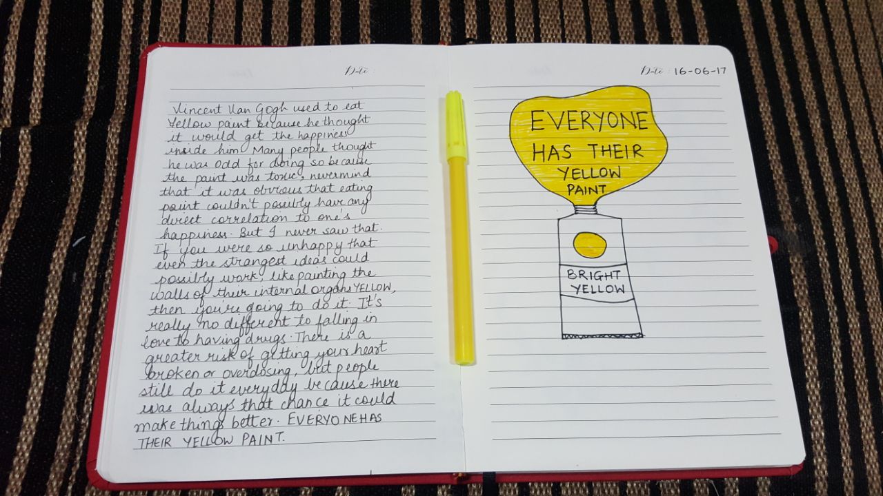 Later, I started using the Stickers from the Journal. One I used was to list down about the “Things I never thought I’d do” and I was extremely proud when I wrote that page. I value spirituality a lot and dedicated a few pages to my ideas on a few topics like healing, new beginnings, holding on – letting go and forgiving others. I doodled one empowering quote that is close to my heart, “If you never try, you’ll never know” because whenever I’d read that page, it’d only encourage me for better. I wrote a page on this blissful ideology of “The Yellow Paint” which talks on how every person owns that yellow paint to make their lives more better.