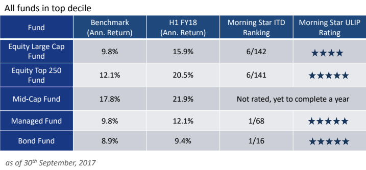 The chart for Superior Investment Funds: ULIP, wherein all funds in top decile are stated in a tabular format below: