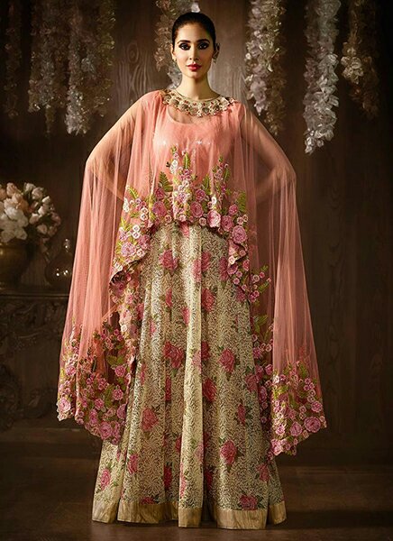 This wedding season, embrace the gorgeous look of cape style Anarkali that can definitely transform you into a princess in no time. Try from the cape style Anarkali collection and choose a warm or bright or different shade of coral colours.