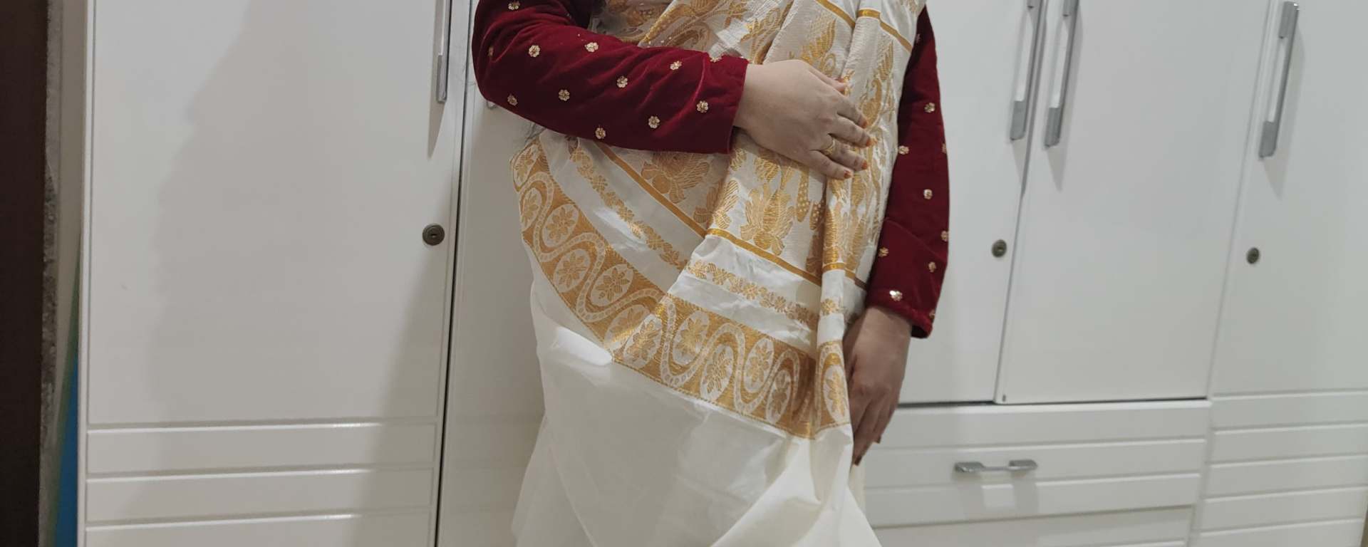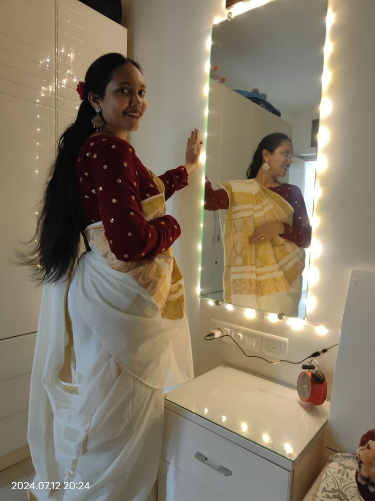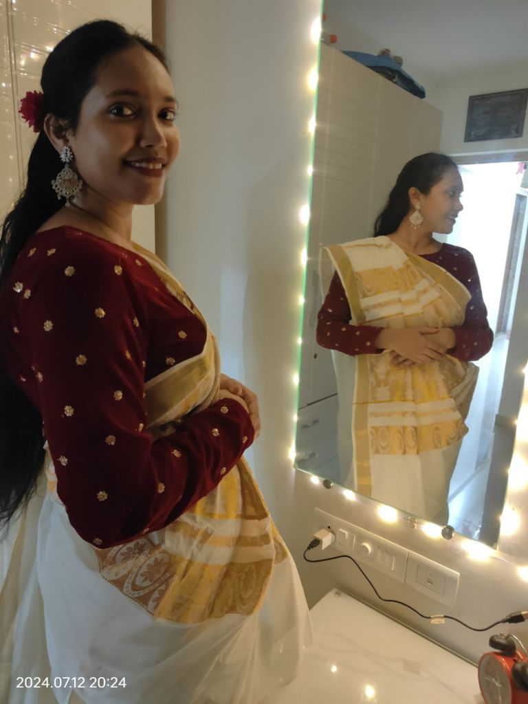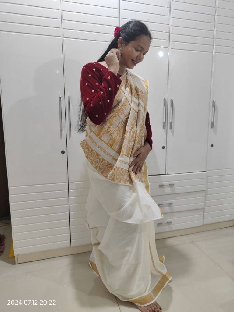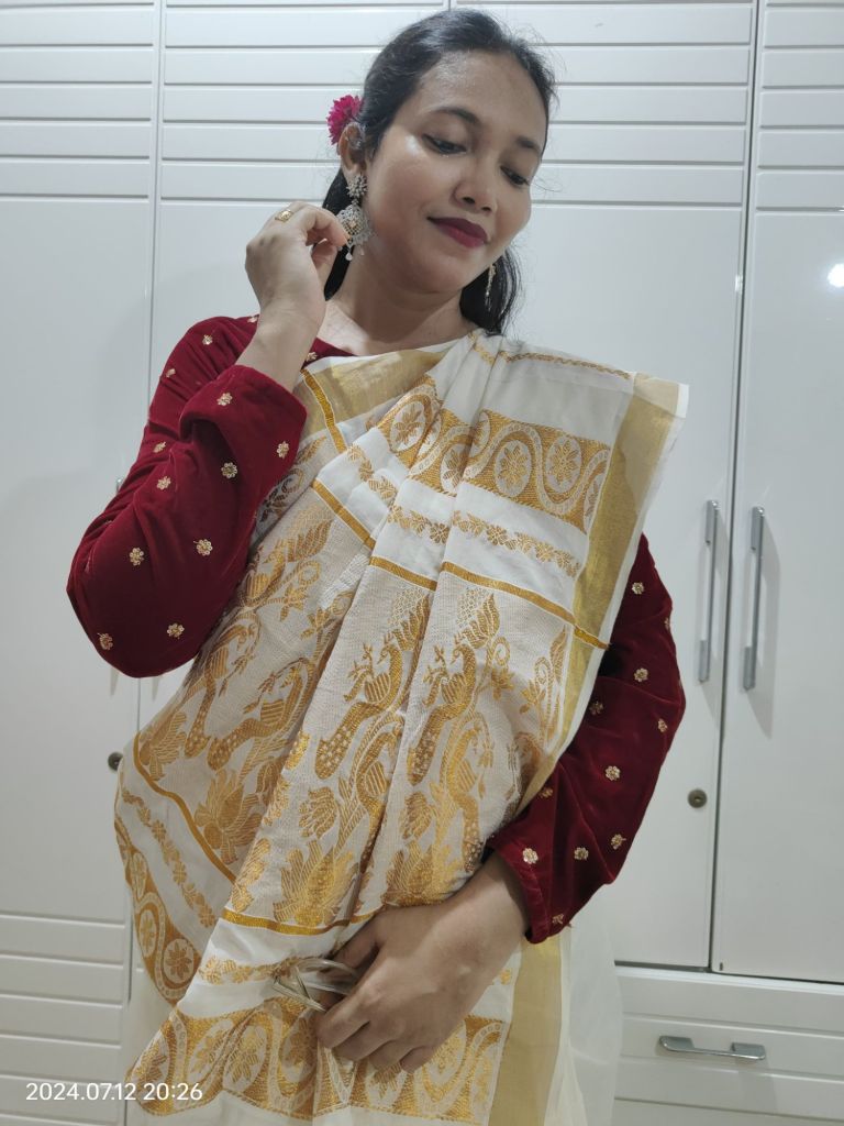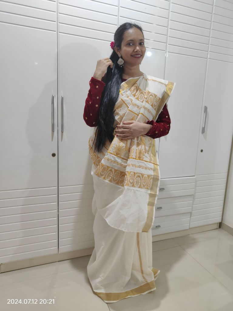 The saree I bought is an off-white Kasavu with a golden border. The design is simple yet elegant, reflecting the rich cultural heritage of Kerala. It’s a traditional piece, but what sets it apart is the modern touch — no need for pleating or pinning, thanks to the one-minute saree option. This feature is a lifesaver for anyone who struggles with draping a saree. They also have a regular saree with traditional draping option.